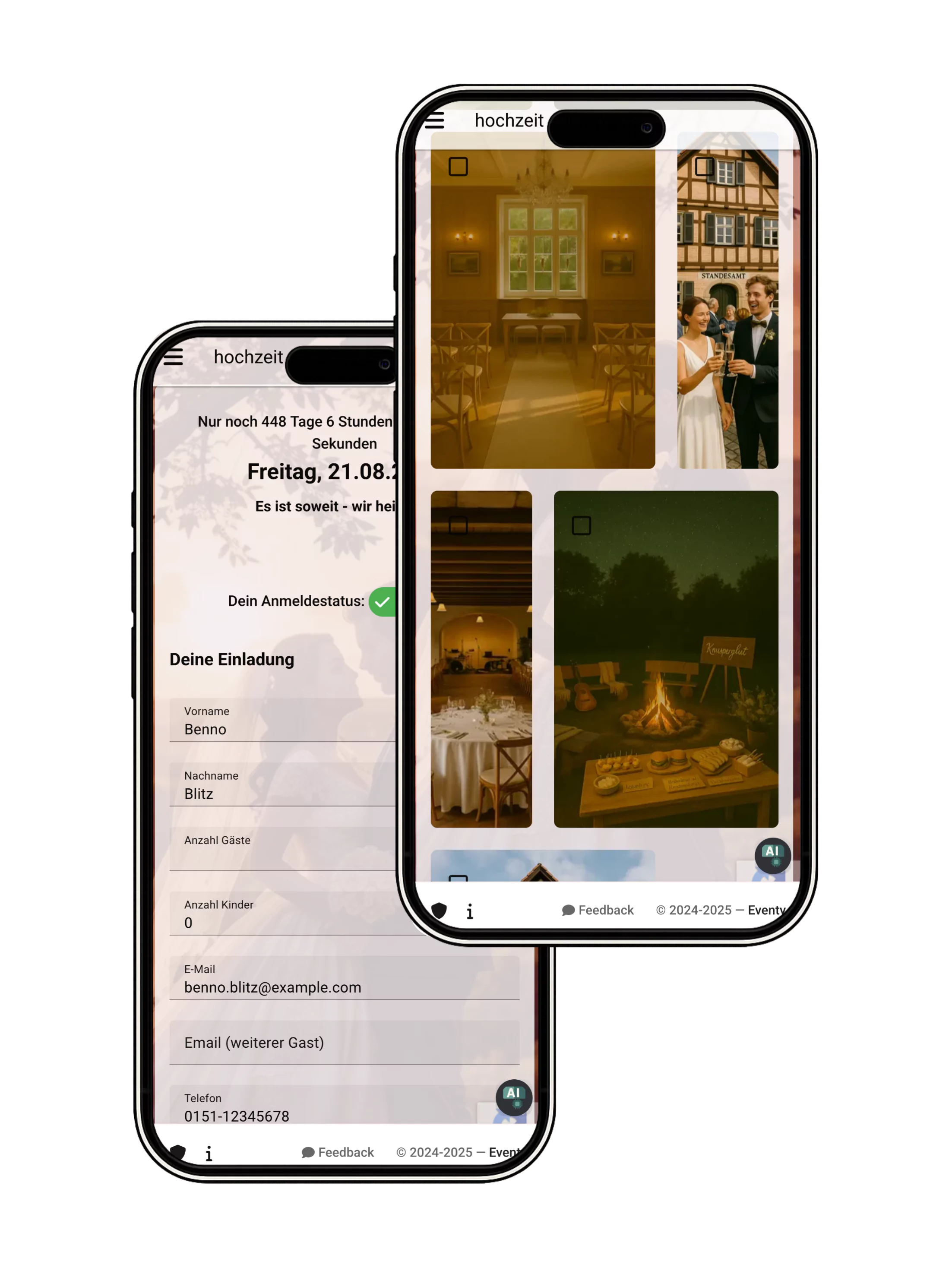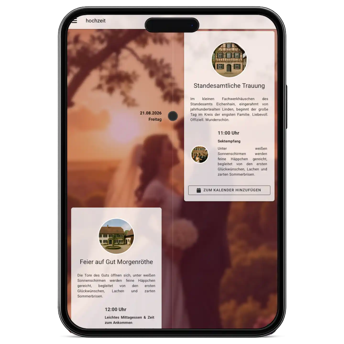 Erstelle in wenigen Minuten eure individuelle Hochzeitswebsite – mit RSVP, Sitzplan, Galerie, Zeitplan & mehr.